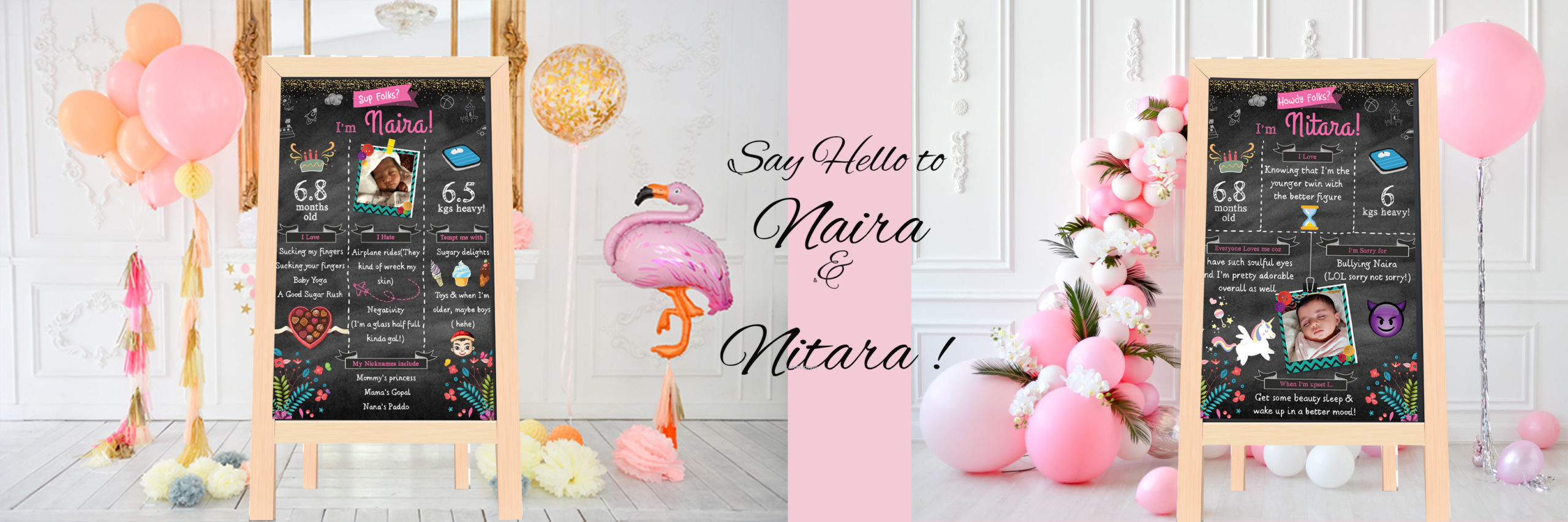 So, when twin baby girls Naira & Nitara had a party thrown in their honor, we decided to celebrate their 2 very distinct personalities by creating 2 massive chalkboards dedicated to each of them, as part of the party’s décor scheme.