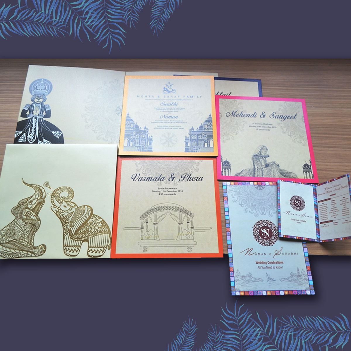 For Naman & Surabhi’s gorgeous backwater wedding in Bolgatty Island, Kerala- We used distinct elements that make God’s Own Country unique. A striking Kathakali (Kerala dance form) performer welcomes the recipient as soon as they open the invitation setting the tone for what’s in store.